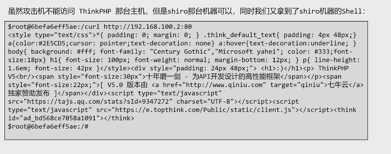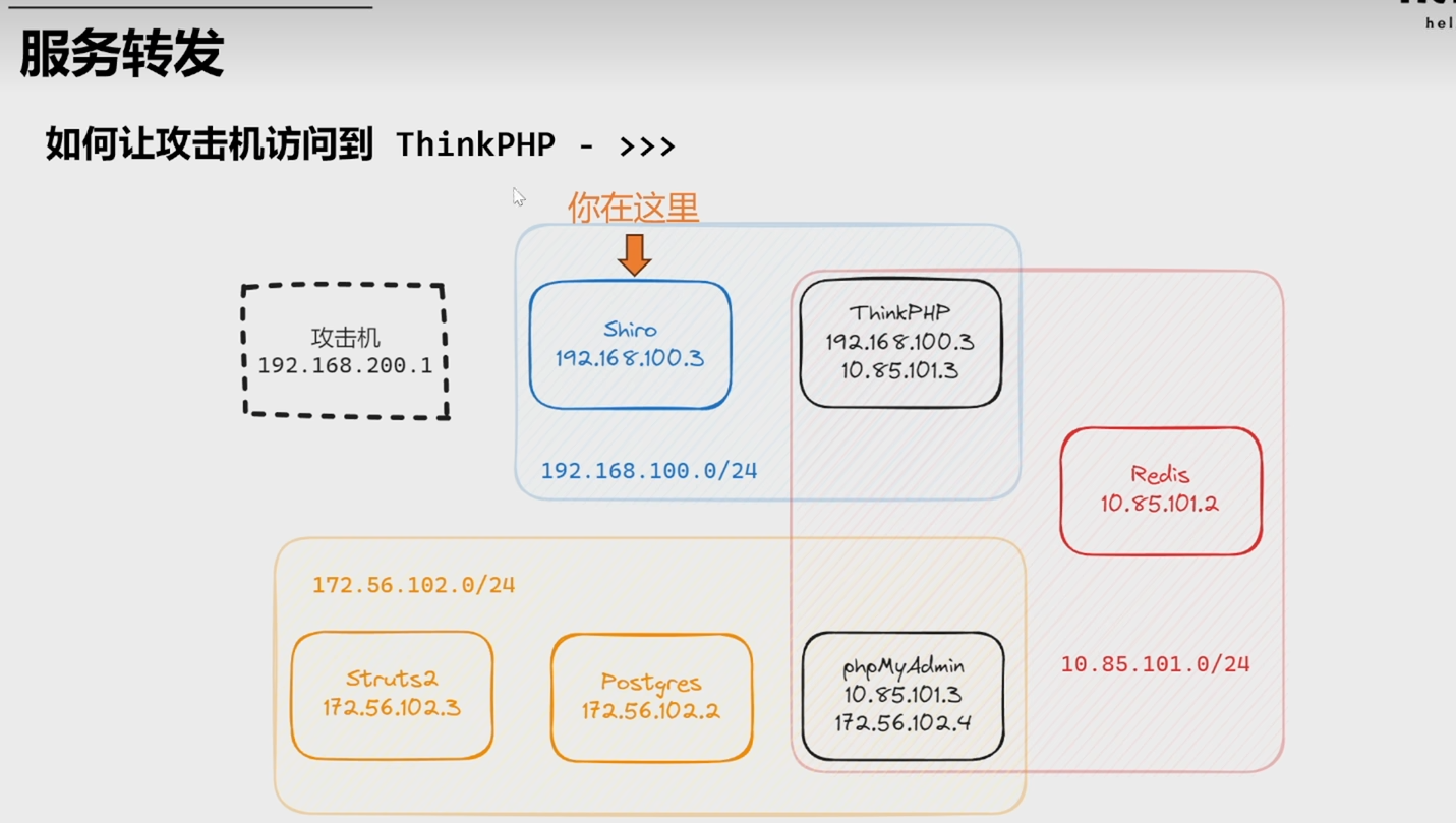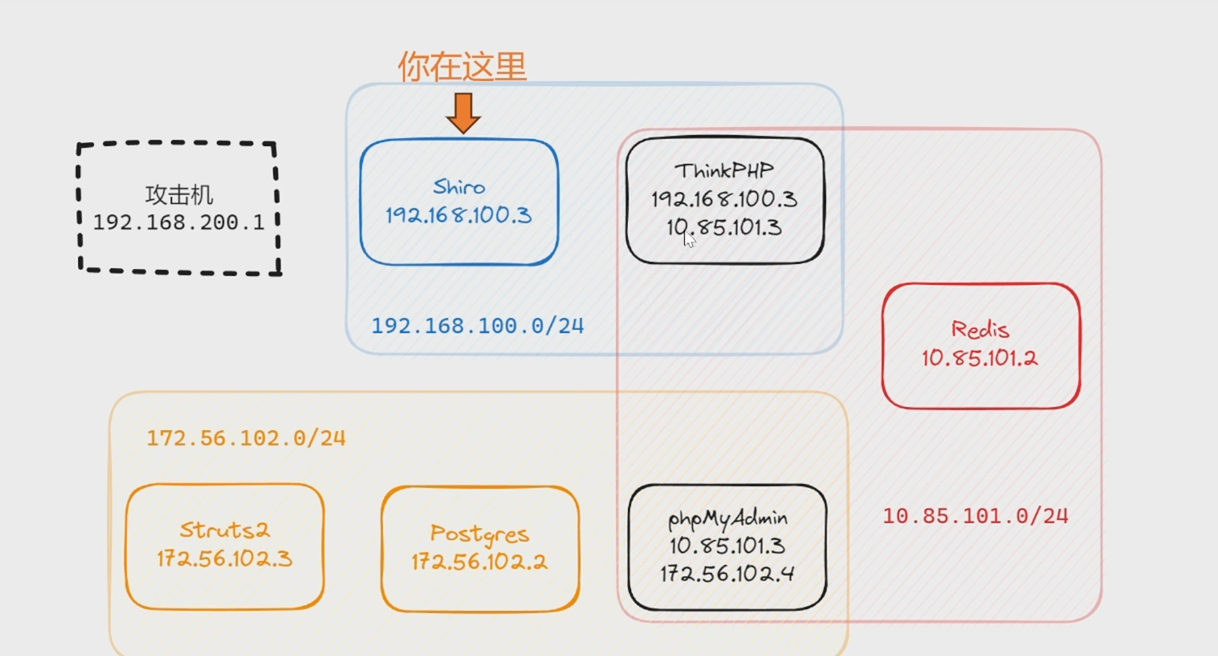 前面fscan扫出来了三台存活主机,但是你其实是不知道其他主机还存在其他网段的,你要上去之后才知道(下面这个图仅供参考,因为docker容器启动的时候ip是随机分配的,理解意思就好)