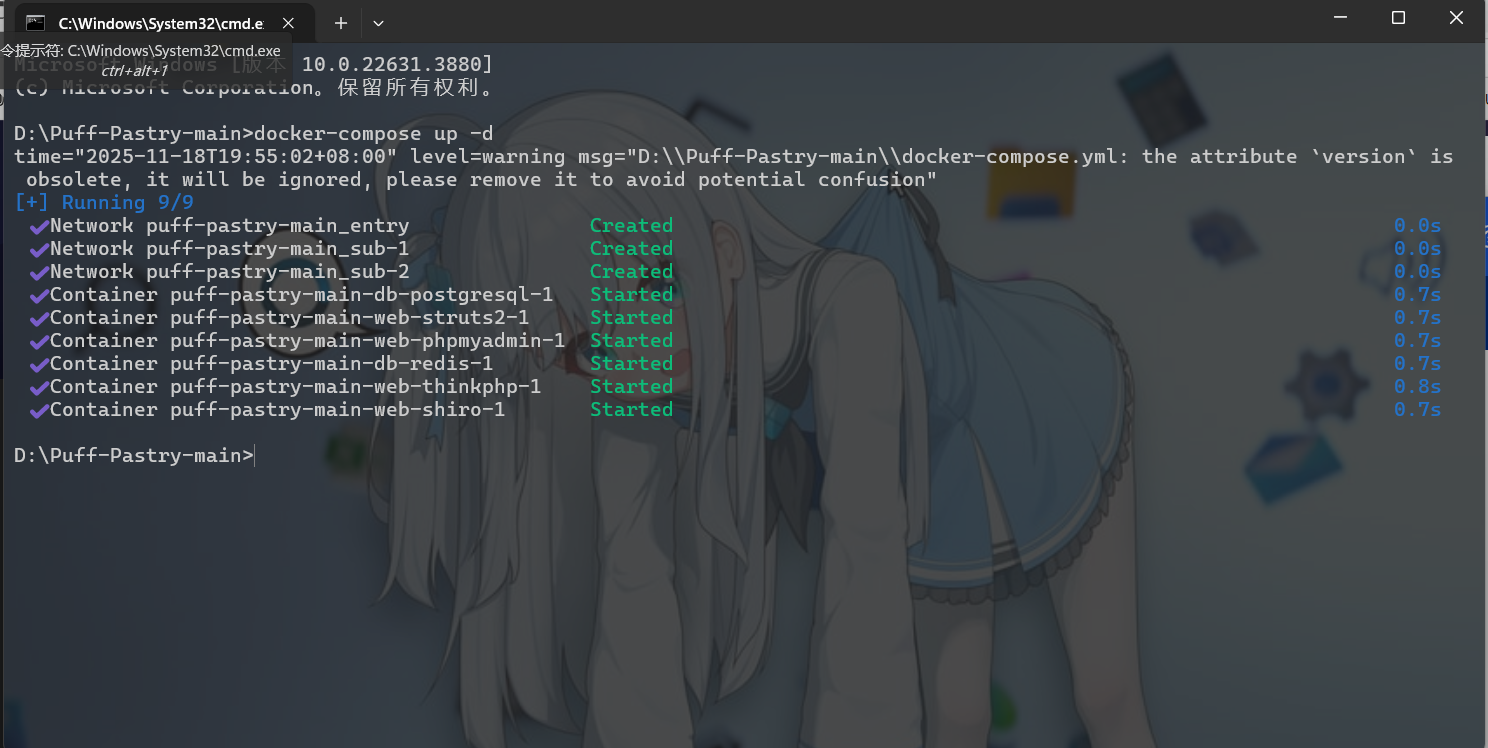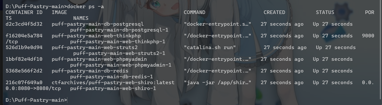 用这个命令看看容器都跑起来没有,如果stastus都显示"up"就代表成功跑起来了