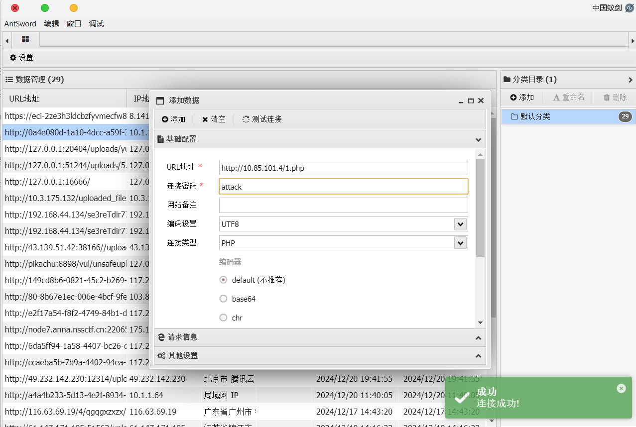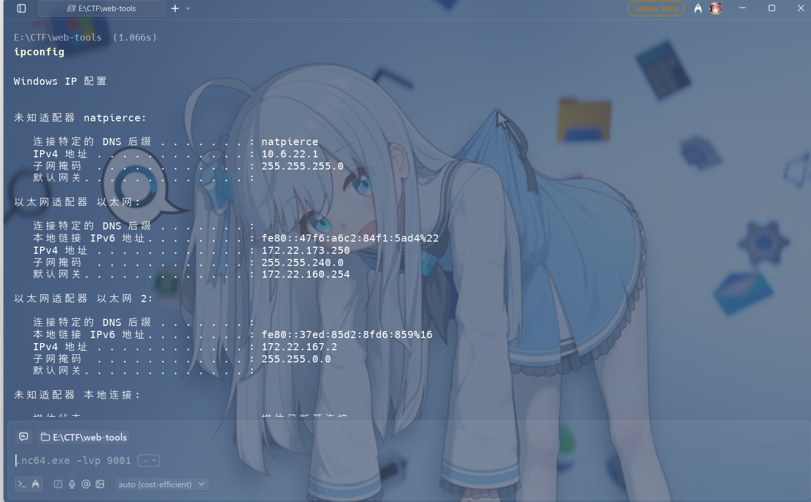 接下来就要进行信息收集了,对于内网来说首先肯定是ip信息,127.0.0.1想都不用想肯定是不用看的,这里我们就上传一些工具帮助我们进行信息收集