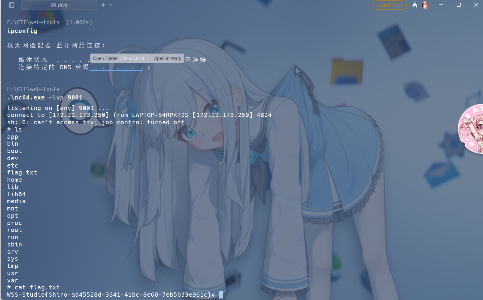 但是发现提示我权限不够,后面询问探姬本人后发现是靶场问题。可以在容器目录下马,phpmyadmin那里提权貌似也有点问题,总之打进内部就好了。