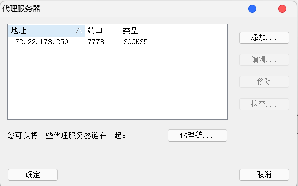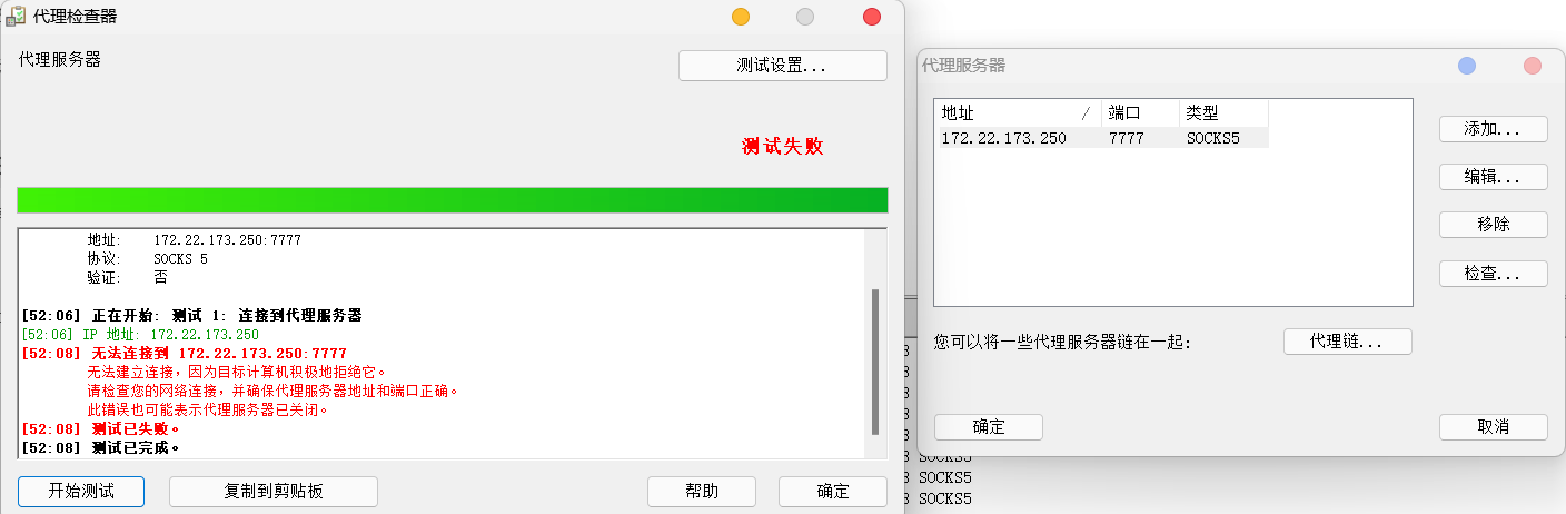 再配置一下proxifier(记得用本地windows主机的ip端口)至于说这里为什么要在原来0节点的基础上改配置我猜应该是0节点暂时不用了所以就先将配置删了(下图是我切换到1节点之后再去测试原来0节点的代理服务器配置发现测试失败了)