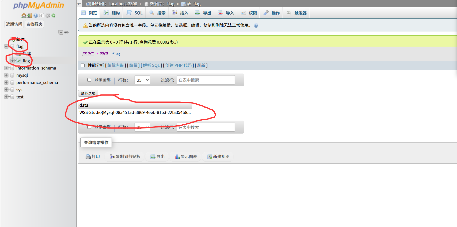 观察左侧数据库名发现有个flag,点进去一看第三个flag就获得了