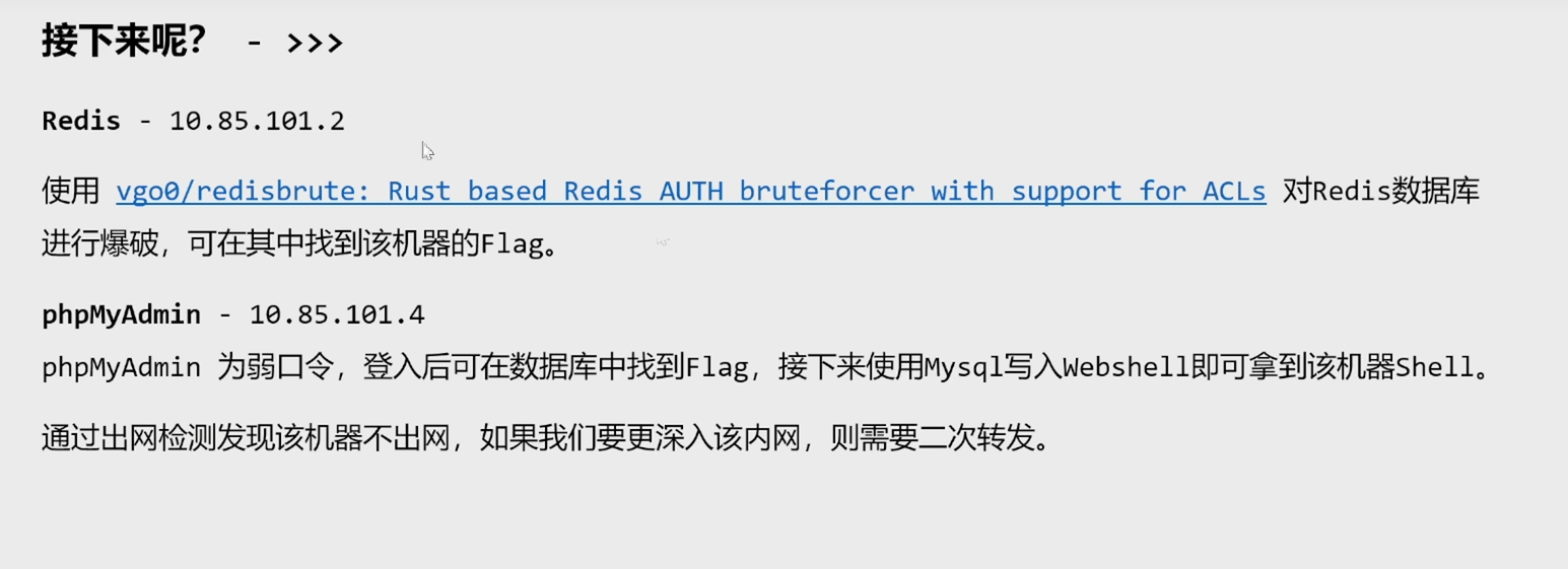 在前面对10.85.101.0/24网段进行扫描的时候其实我们扫出来过一个 10.85.101.2:6379,这就是拓扑图中的redis服务,直接用redisbrute工具爆破密码即可,-p指定字典,-T指定爆破目标
