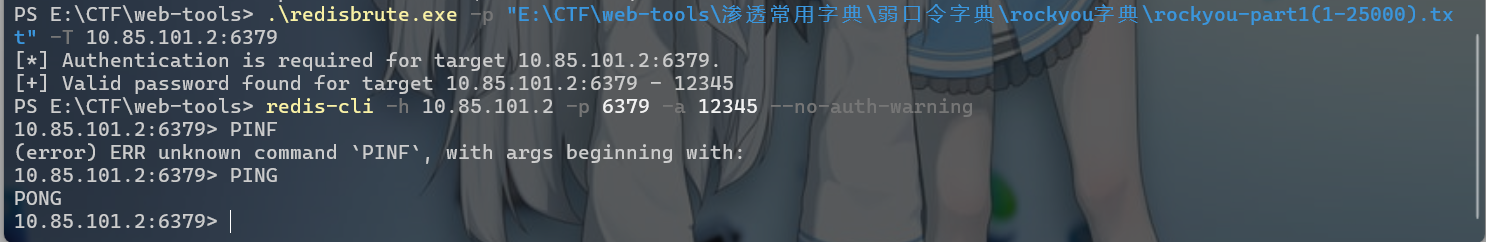 阅读下图可以发现我们成功爆破出密码123456,然后利用redis-cli连接上redis服务,输入PING观察回显,回显PONG表示客户端与 Redis 服务端通信正常,服务端在响应。