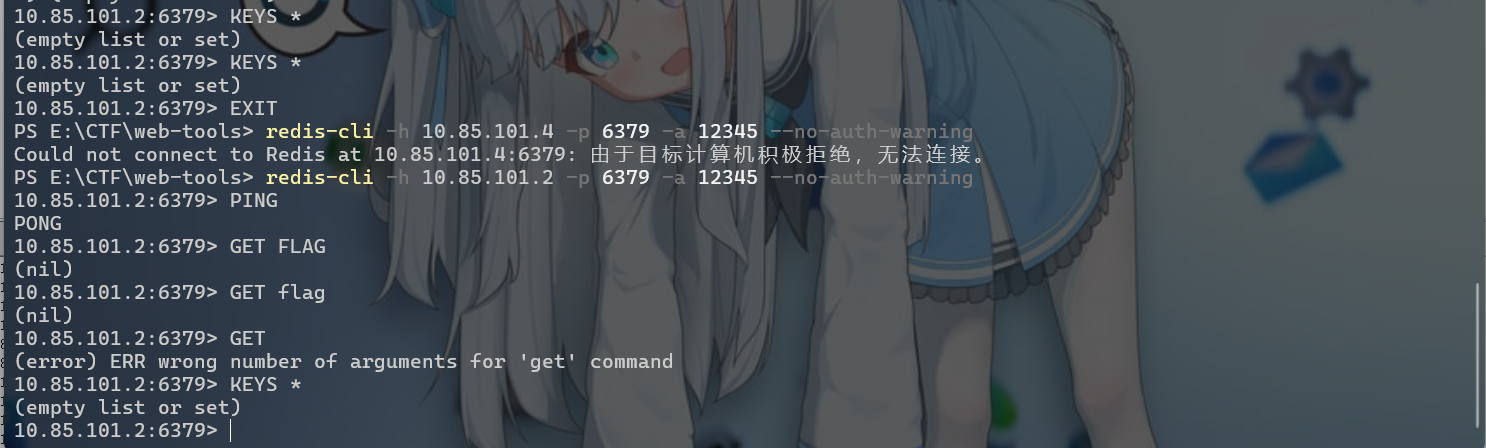 输入KEYS *返回数据库中匹配模式 * 的所有键,但是显示空的,GET flag也是空的,这里貌似出了点问题,搞不到flag