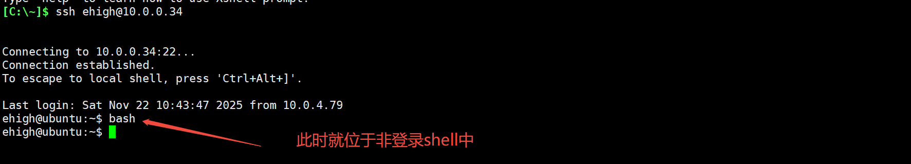 例如:我已经使用 xshell 等ssh客户端工具连接到服务器了,然后我再 执行 bash 命令系统的shell,这就是一个非登录shell。