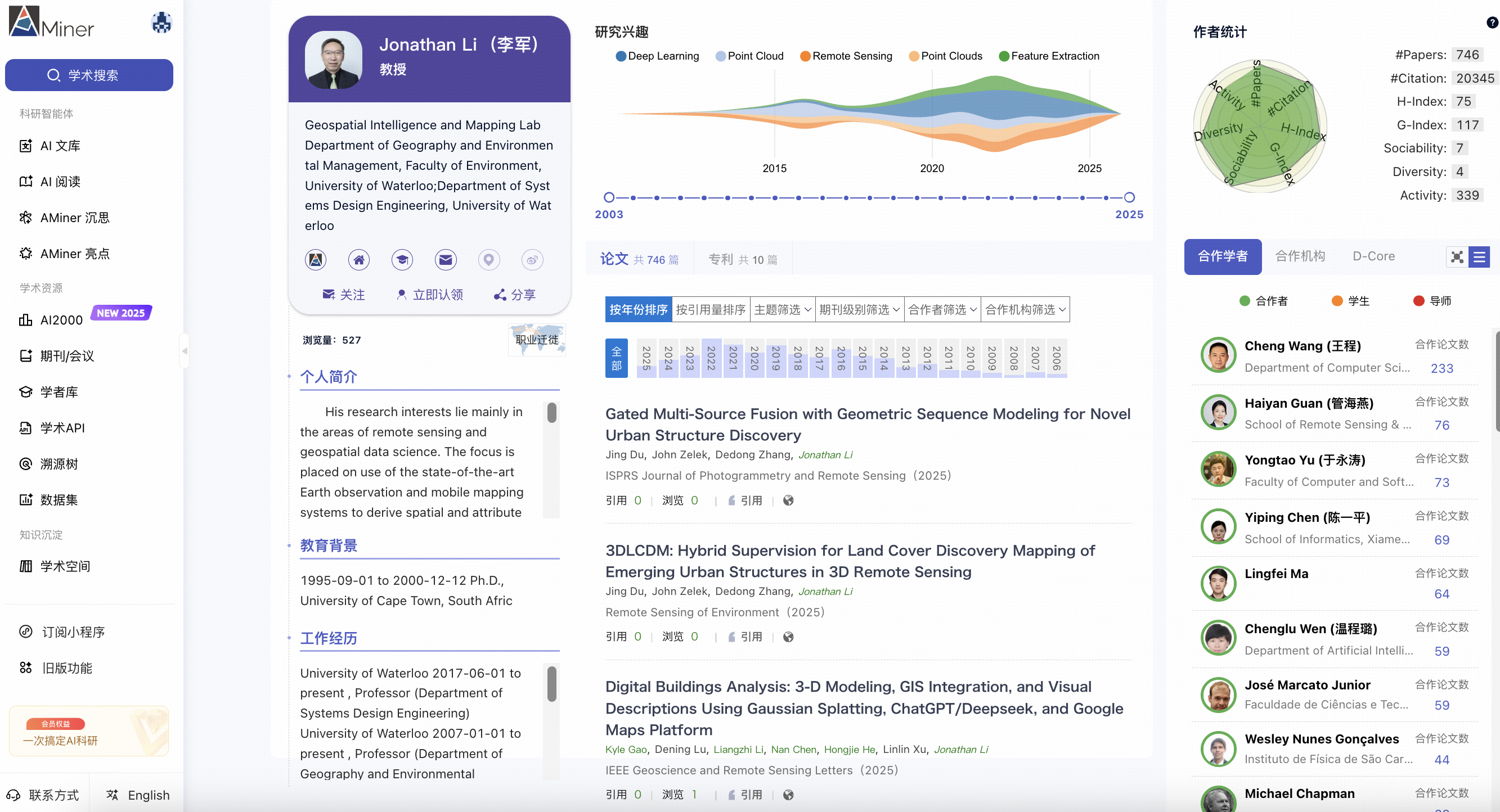 是《International Journal of Applied Earth Observation and Geoinformation》核心高产作者之一,在该期刊相关统计中, 其引用数达 33,论文数为 7 篇 。他的研究聚焦激光雷达遥感、城市地理信息融合与地物智能分类,涵盖多源遥感数据处理、时空大数据分析等交叉领域,其发表的论文《YOLOShipTracker: Tracking Ships in SAR Images Using Lightweight YOLOv8》(可通过 AMiner 检索:https://www.aminer.cn/pub/66e2186101d2a3fbfc4a99fd/?f=fwh_am_v1)既解决了 SAR 图像船舶检测的技术痛点,又兼顾了工业级应用的效率需求,为海事智能监测提供了有价值的技术参考。