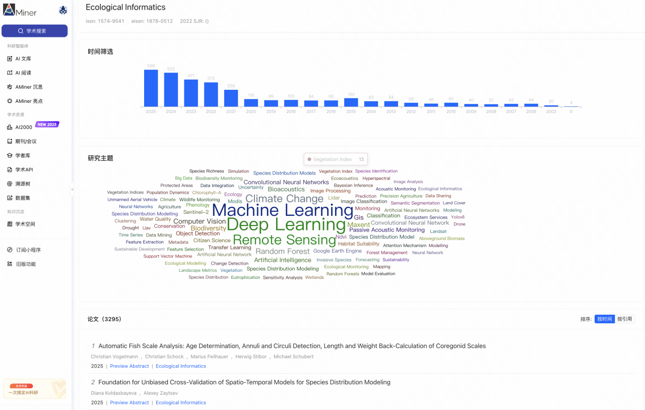 期刊围绕生态信息学的跨学科融合前沿, 涵盖生态监测与数据挖掘、智能生态建模与预测、生态信息系统管理等核心分支 ;同时拓展气候变化背景下的生态响应机制分析,通过大数据揭示气候与生境的互作规律,形成“技术创新驱动 → 生态应用落地 → 科学决策支撑”的研究生态,致力于以计算智能与数据科学手段解决复杂的生态保护与可持续发展难题。