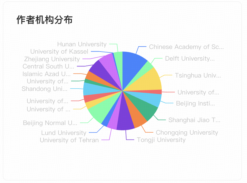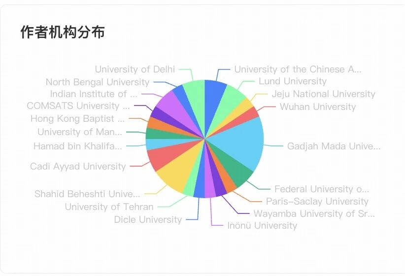 从国家或地区分布来看, 印度、美国、中国是该刊的核心发文力量,同时巴西、意大利、巴基斯坦 等多国也积极参与其中;在作者机构方面, 德里大学、武汉大学、巴西联邦大学等国内外高校及科研机构 建起深度研究网络,呈现出 “区域特色高校 + 全球遥感应用强校” 的合作态势,推动遥感技术在不同区域场景下的特色化应用与创新。