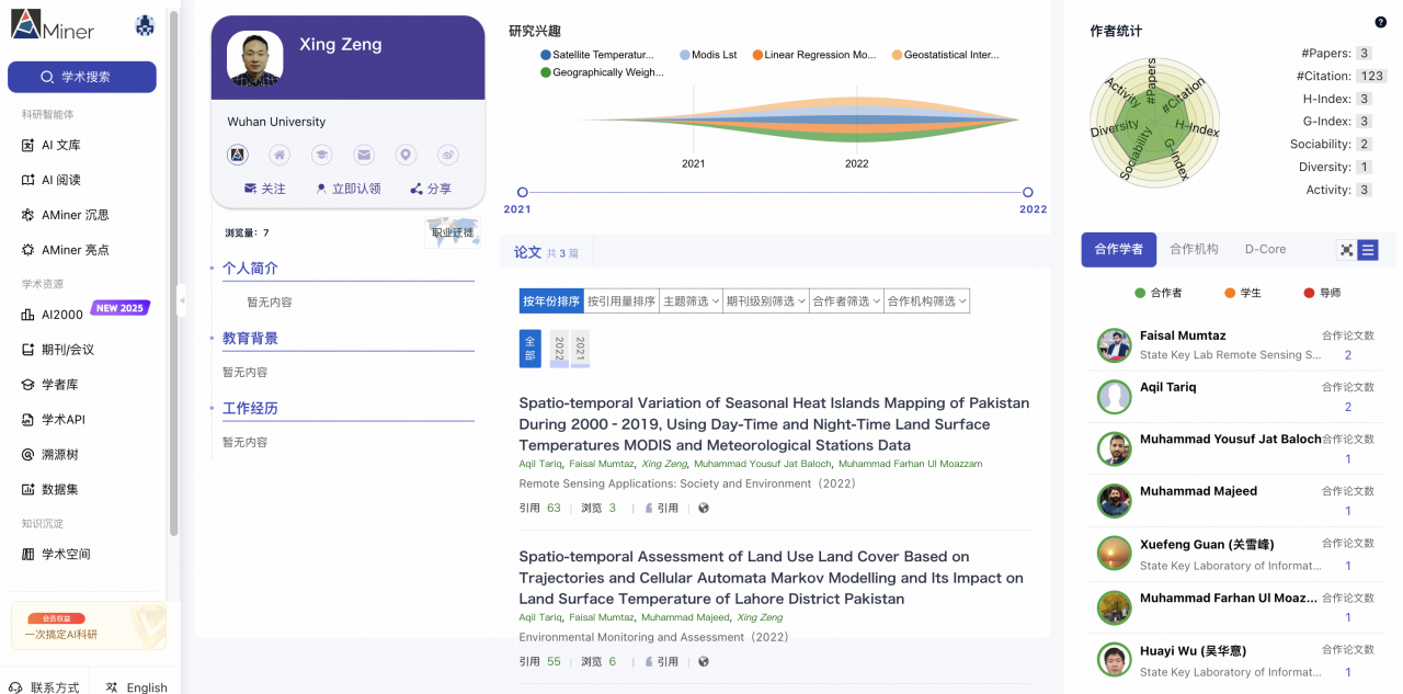 Xing Zeng 是《Remote Sensing Applications: Society and Environment》的 核心高引作者之一,引用数达 63,论文数 1 篇。 其研究聚焦遥感技术在社会环境议题中的突破性应用,成果围绕 “遥感赋能区域环境治理” 展开, 其发表的《Spatio-temporal Variation of Seasonal Heat Islands Mapping of Pakistan During 2000–2019, Using Day-Time and Night-Time Land Surface Temperatures MODIS and Meteorological Stations Data》(可通过AMiner检索 : https://www.aminer.cn/pub/637766ba90e50fcafdae333a/?f=fwh_am_v1) 既解决了巴基斯坦热岛监测的技术与数据痛点,又为其城市可持续发展提供了科学支撑,体现了遥感在区域气候治理中的实用价值。