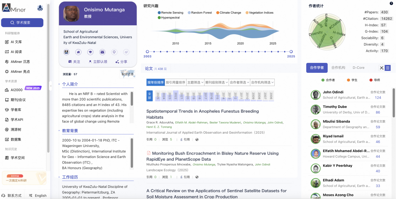 Onisimo Mutanga 是期刊核心高产作者之一, 引用数 24,论文数 3 篇。 他的研究长期聚焦 “遥感技术在农业与生态监测中的应用”,围绕精准农业、植被动态监测、土地退化评估等方向持续输出成果。 其发表论文《Assessing Drivers of Vegetation Fire Occurrence in Zimbabwe - Insights from Maxent Modelling and Historical Data Analysis》( 可通过 AMiner 检索: https://www.aminer.cn/pub/673f7feaae8580e7ff143c27/?f=fwh_am_v1) 这篇论文是 生态模型跨领域应用结合区域环境问题解决的典型研究,既展示了 Maxent 模型在火灾研究中的潜力,又为津巴布韦的火灾管理和生态保护提供了可落地的科学建议。