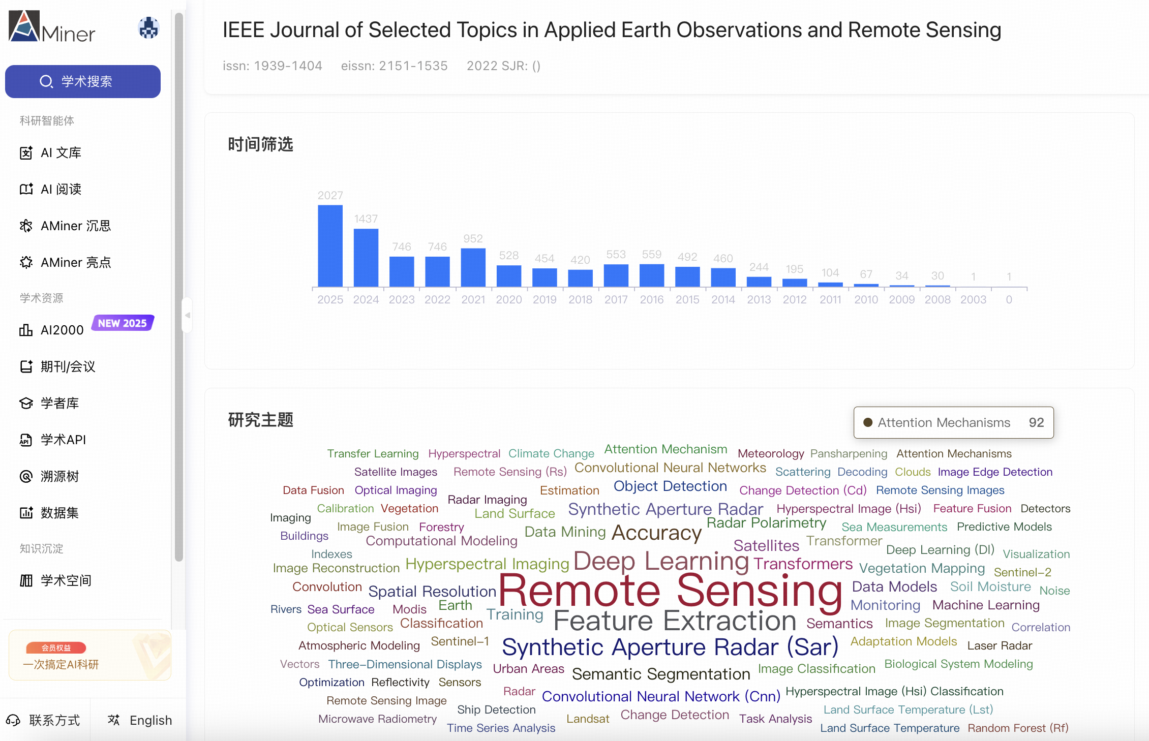 《IEEE Journal of Selected Topics in Applied Earth Observations and Remote Sensing》是IEEE旗下地球观测与遥感领域的权威期刊,该刊聚焦应用地球观测与遥感技术的跨领域研究, 2025 年影响因子约为5.2,在 JCR 分区中位列遥感领域Q1(排名 12/62,百分位 80.6%),中科院分区地球科学大类2 区,是遥感应用领域兼具学术影响力与工程实践价值的顶尖期刊。 从年发文量趋势看,期刊近年呈爆发式增长:2025 年发文 2027 篇、2024 年 1437 篇、2023 年 746 篇,反映出应用遥感技术在地球观测领域的研究热度持续攀升,为遥感方法创新与行业落地应用提供了优质学术交流平台。