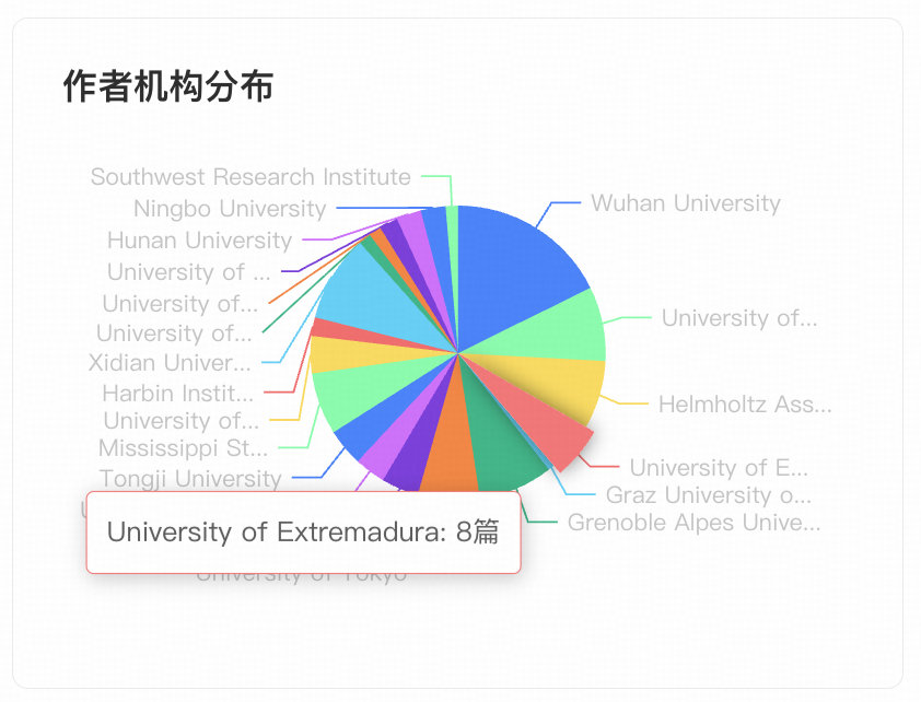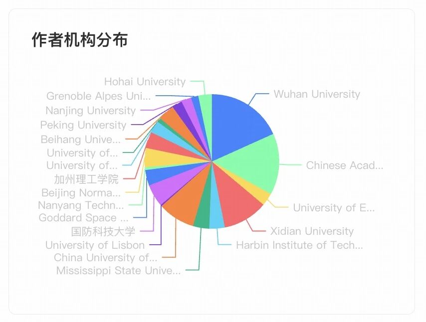 从国家来看, 美国和中国是主要的发文力量,同时法国、意大利、德国这些欧洲国家也有不少研究。 机构方面,像武汉大学在遥感和人工智能的结合上做得很深入; 法国国家科学研究中心 在地球科学基础研究和遥感应用的交叉领域很有特色; 美国NASA 则在地球观测的大型项目和应用上贡献突出。这些国内外的顶尖高校和科研机构,有的专注基础研究,有的侧重技术在气象、环境、城市这些场景的落地,形成了从基础研究到实际应用的完整链条。