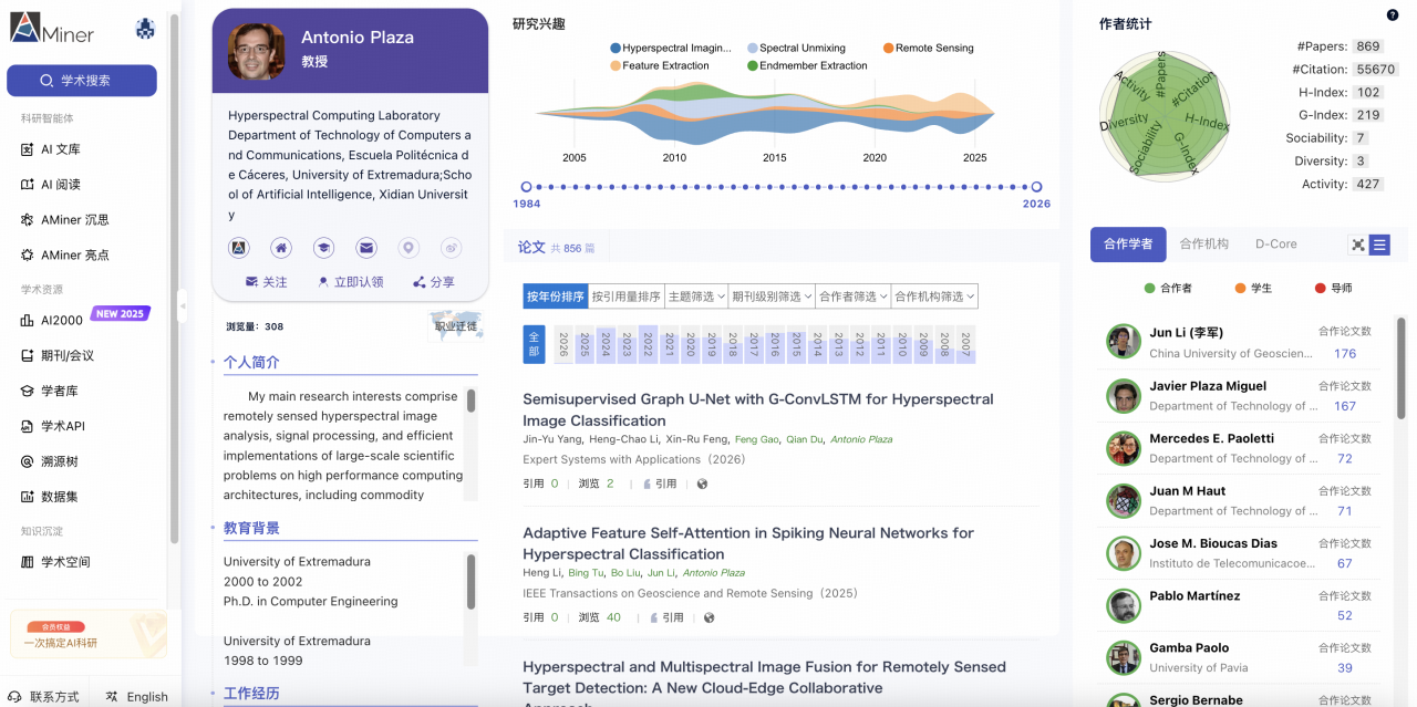 Antonio Plaza 是《IEEE Journal of Selected Topics in Applied Earth Observations and Remote Sensing》的核心作者之一, 引用数达 8564,论文数 110 篇。其研究聚焦高光谱遥感数据处理与分析,在高光谱图像分类、特征提取、数据融合等方向成果丰硕, 为高光谱遥感从数据获取到应用落地的全链条研究提供了关键方法支撑,是应用遥感领域的标杆性学者。发表的《MTP: Advancing Remote Sensing Foundation Model Via Multi-Task Pretraining》(可通过AMiner检索:https://www.aminer.cn/pub/683e40da163c01c850944b94/?f=fwh_am_v1)论文是遥感技术结合矿区生态治理的典型应用研究,既解决了禹州矿区生态监测的技术痛点,又为其可持续发展提供了科学支撑,体现了遥感在资源开发区生态管理中的实用价值。