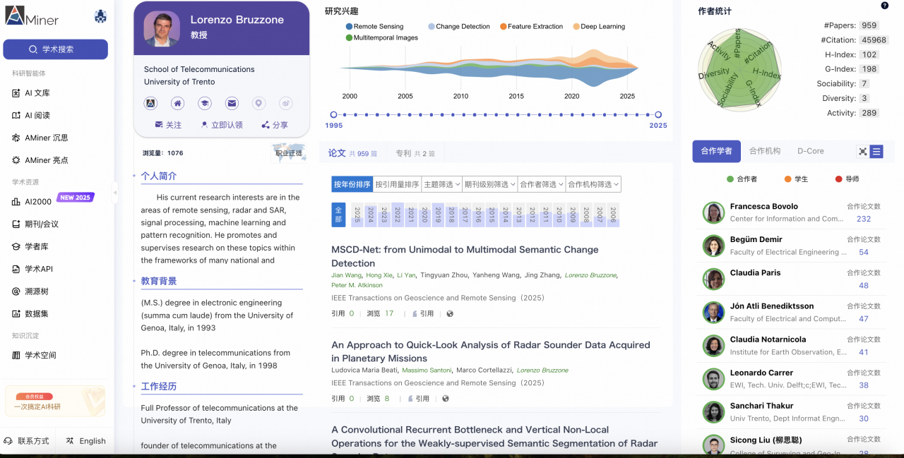 Lorenzo Bruzzone 是 期刊核心高产作者,论文数 31 篇,引用数 1215。他长期致力于遥感数据的变化检测与场景分析, 研究成果广泛应用于环境监测、灾害管理等领域, 为遥感技术从 “数据获取” 到 “决策支撑” 的转化提供了可落地的方法论参考 。其发表的论文《A Survey of Sample-Efficient Deep Learning for Change Detection in Remote Sensing: Tasks, Strategies, and Challenges》 ( 可通过 AMiner 检索:https://www.aminer.cn/pub/67a41dd6ae8580e7ff37c16f /?f=fwh_am_v1 )系统梳理了该领域的任务类型、技术策略与现存挑战,为遥感变化检测的算法创新与工程应用提供了全景式参考。