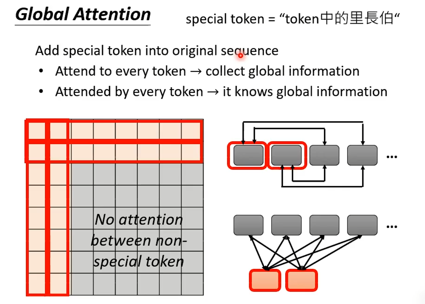 在输入序列中引入一个或多个特殊的标记,如图中红色高亮的部分。这个特殊标记扮演着“信息枢纽”或“全局信使”的角色,图中用中文“token中的里长伯”来形容它,非常贴切地表明了它作为信息汇聚和分发中心的职能。如下图所示。