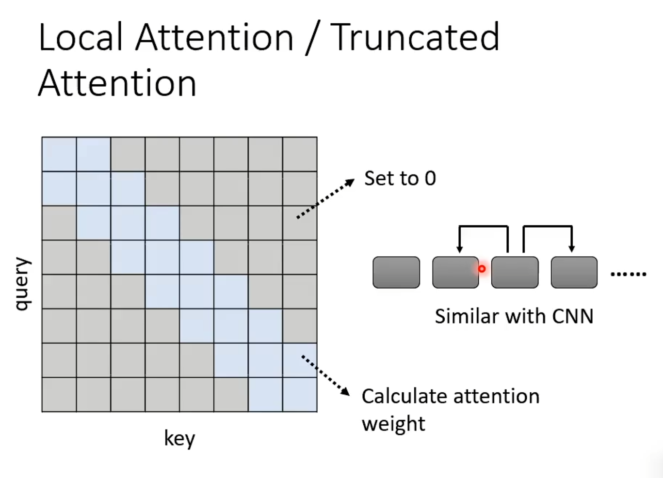 与标准自注意力中每个查询需要与所有键进行计算不同,局部注意力为每个查询只分配一个有限的、局部的感受野。如图所示,对于序列中的每个位置,我们只计算它与邻近位置(一个窗口内)的键的注意力权重,而将这个窗口范围外的所有连接“设为0”(Set to 0),这意味着模型会完全忽略远处位置的信息。