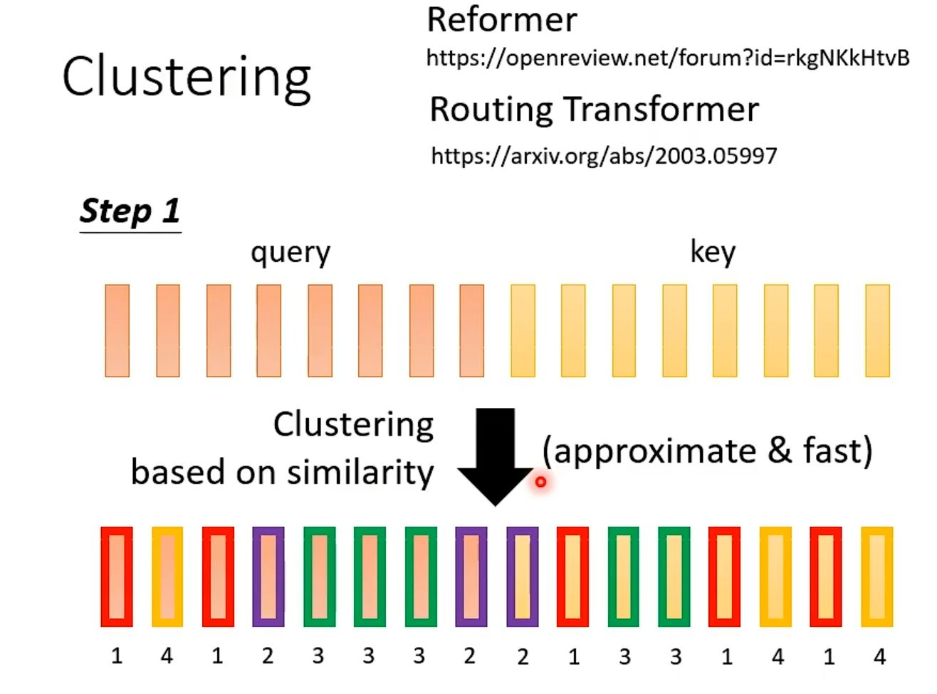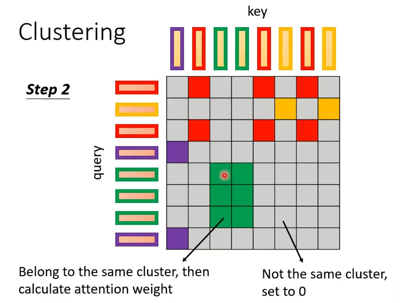 起初根据查询(query)和键(key)向量的相似性,对它们进行迅速、近似的聚类操作,将整个序列划分到若干个簇中,如图中标注的簇1、2、3、4。其根本目的是为了限制每个查询的计算范围:一个查询将不再与序列中的所有键进行计算,而只应该与它所属的同一个簇内的键进行注意力交互。