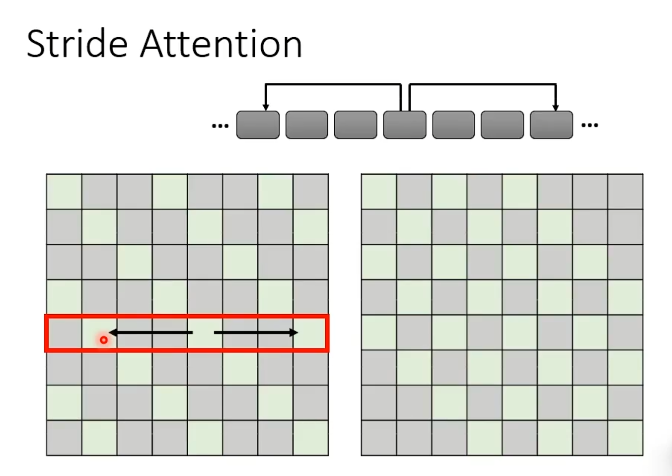 图中红色高亮区域和双向箭头形象地表示了这些稀疏分布的注意力窗口。每个窗口内的查询会与其周围一个局部区域内的键进行交互,但窗口与窗口之间是间隔开的。这样做的巨大优势在于,它用极少的计算代价就获得了覆盖整个序列的、具有跳跃性的“感受野”。相比于标准自注意力需要计算N×N次交互,步幅注意力只计算了与窗口数量成正比次数的交互,从而显著提升了效率。
