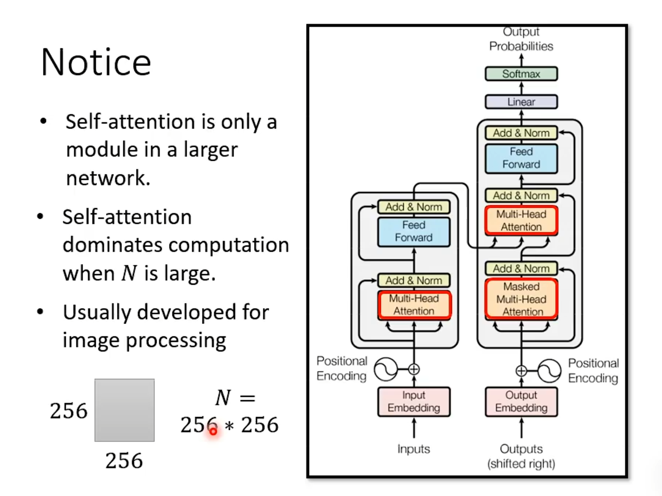 尽管只是一个模块,当序列长度N变得非常大时(例如在处理高分辨率图像时,像素点数量N会达到256x256=65536这样一个巨大的数字),自注意力层的计算量会占据主导地位,成为整个模型的计算瓶颈。