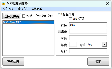 选择MP3文件所在文件夹,左边列表点击选择文件,右边设置文件信息,点击更新信息按钮即可。