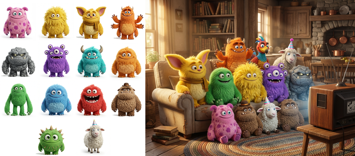 在一个项目里,它能稳稳保持最多5个角色的形象一致,还能让最多14个重要物体在不同场景里不“走样”。这对做系列漫画、品牌宣传或者产品展示来说,简直是神器。