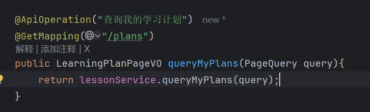 public LearningPlanPageVO queryMyPlans(PageQuery query){return lessonService.queryMyPlans(query);