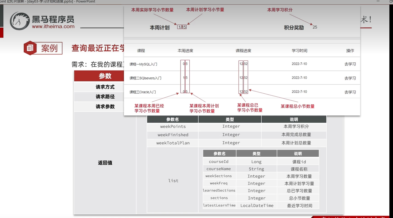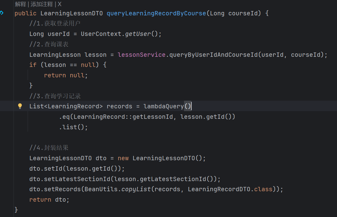 public LearningPlanPageVO queryMyPlans(PageQuery query) {LearningPlanPageVO result = new LearningPlanPageVO();// 1.获取当前登录用户Long userId = UserContext.getUser();// 2.获取本周起始时间LocalDate now = LocalDate.now();LocalDateTime begin = DateUtils.getWeekBeginTime(now);LocalDateTime end = DateUtils.getWeekEndTime(now);// 3.查询总的统计数据// 3.1.本周总的已学习小节数量Integer weekFinished = recordMapper.selectCount(new LambdaQueryWrapper().eq(LearningRecord::getUserId, userId).eq(LearningRecord::getFinished, true).gt(LearningRecord::getFinishTime, begin).lt(LearningRecord::getFinishTime, end));result.setWeekFinished(weekFinished);// 3.2.本周总的计划学习小节数量Integer weekTotalPlan = getBaseMapper().queryTotalPlan(userId);result.setWeekTotalPlan(weekTotalPlan);// TODO 3.3.本周学习积分// 4.查询分页数据// 4.1.分页查询课表信息以及学习计划信息Page p = lambdaQuery().eq(LearningLesson::getUserId, userId).eq(LearningLesson::getPlanStatus, PlanStatus.PLAN_RUNNING).in(LearningLesson::getStatus, LessonStatus.NOT_BEGIN, LessonStatus.LEARNING).page(query.toMpPage("latest_learn_time", false));List records = p.getRecords();if (CollUtils.isEmpty(records)) {return result.emptyPage(p);}// 4.2.查询课表对应的课程信息Map cMap = queryCourseSimpleInfoList(records);// 4.3.统计每一个课程本周已学习小节数量List list = recordMapper.countLearnedSections(userId, begin, end);Map countMap = IdAndNumDTO.toMap(list);// 4.4.组装数据VOList voList = new ArrayList<>(records.size());for (LearningLesson r : records) {// 4.4.1.拷贝基础属性到voLearningPlanVO vo = BeanUtils.copyBean(r, LearningPlanVO.class);// 4.4.2.填充课程详细信息CourseSimpleInfoDTO cInfo = cMap.get(r.getCourseId());if (cInfo != null) {vo.setCourseName(cInfo.getName());vo.setSections(cInfo.getSectionNum());}// 4.4.3.每个课程的本周已学习小节数量vo.setWeekLearnedSections(countMap.getOrDefault(r.getId(), 0));voList.add(vo);}return result.pageInfo(p.getTotal(), p.getPages(), voList);