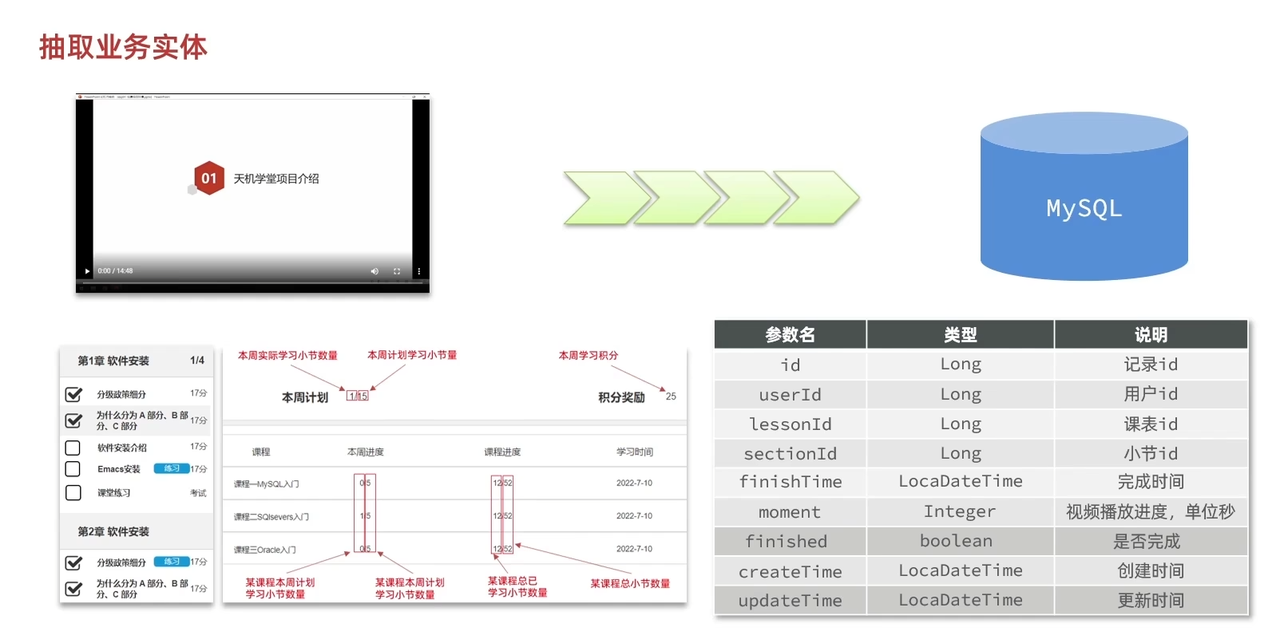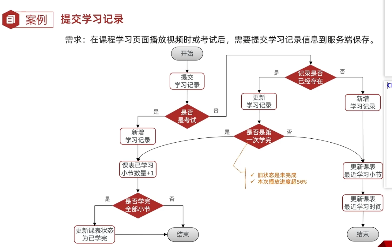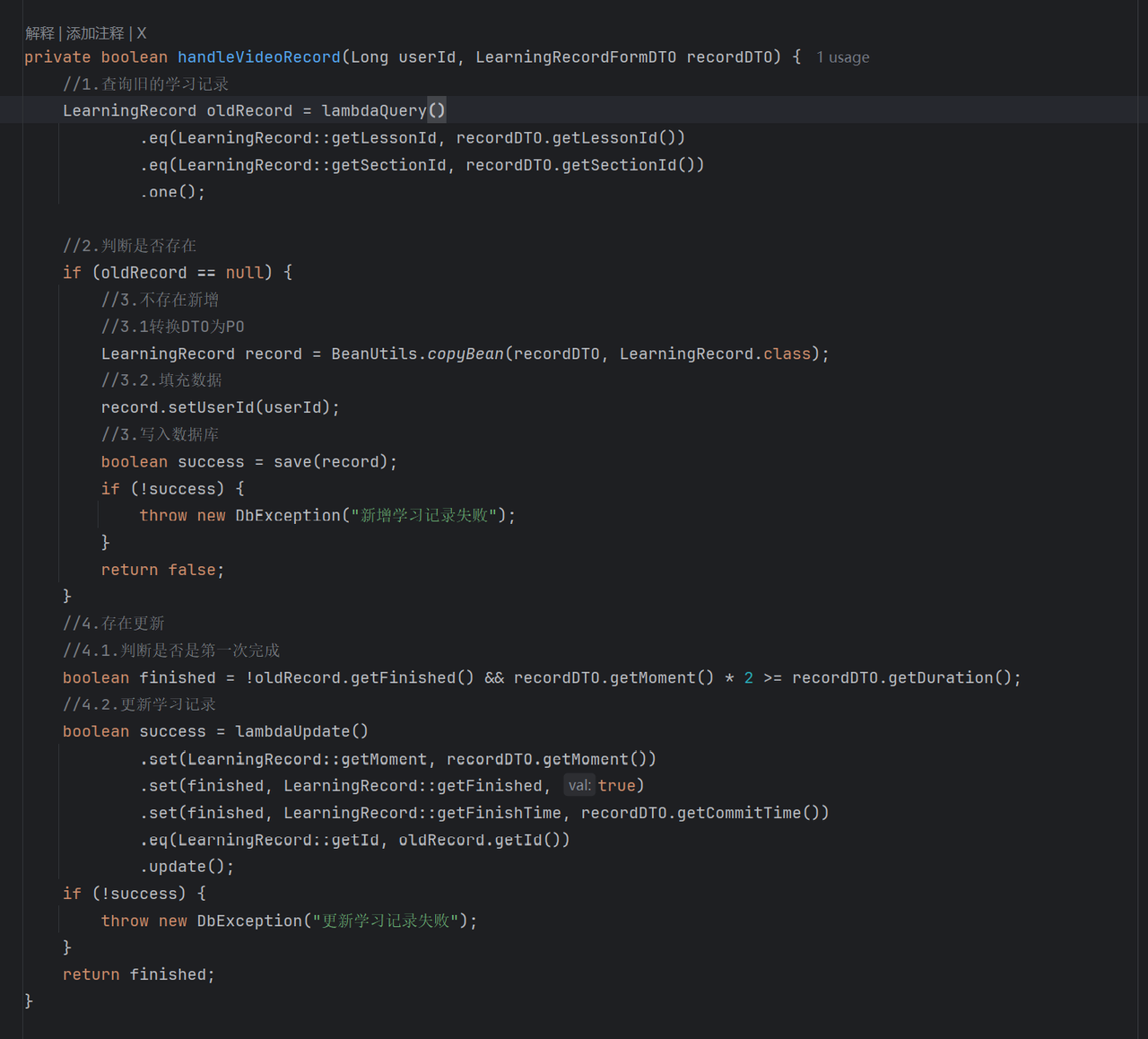 private boolean handleVideoRecord(Long userId, LearningRecordFormDTO recordDTO) {//1.查询旧的学习记录LearningRecord oldRecord = lambdaQuery().eq(LearningRecord::getLessonId, recordDTO.getLessonId()).eq(LearningRecord::getSectionId, recordDTO.getSectionId()).one();//2.判断是否存在if (oldRecord == null) {//3.不存在新增//3.1转换DTO为POLearningRecord record = BeanUtils.copyBean(recordDTO, LearningRecord.class);//3.2.填充数据record.setUserId(userId);//3.写入数据库boolean success = save(record);if (!success) {throw new DbException("新增学习记录失败");}return false;}//4.存在更新//4.1.判断是否是第一次完成boolean finished = !oldRecord.getFinished() && recordDTO.getMoment() * 2 >= recordDTO.getDuration();//4.2.更新学习记录boolean success = lambdaUpdate().set(LearningRecord::getMoment, recordDTO.getMoment()).set(finished, LearningRecord::getFinished, true).set(finished, LearningRecord::getFinishTime, recordDTO.getCommitTime()).eq(LearningRecord::getId, oldRecord.getId()).update();if (!success) {throw new DbException("更新学习记录失败");}return finished;