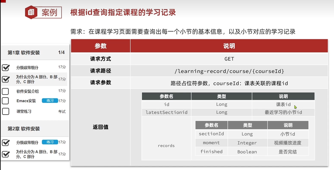@ApiOperation("查询当前用户指定课程的学习记录")
