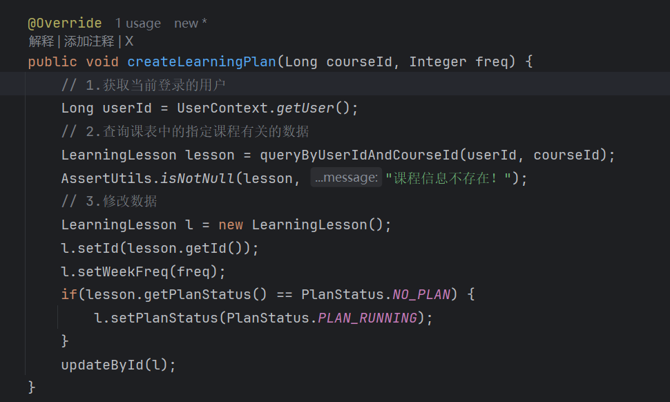 public void createLearningPlan(Long courseId, Integer freq) {// 1.获取当前登录的用户Long userId = UserContext.getUser();// 2.查询课表中的指定课程有关的数据LearningLesson lesson = queryByUserIdAndCourseId(userId, courseId);AssertUtils.isNotNull(lesson, "课程信息不存在!");// 3.修改数据LearningLesson l = new LearningLesson();l.setId(lesson.getId());l.setWeekFreq(freq);if(lesson.getPlanStatus() == PlanStatus.NO_PLAN) {l.setPlanStatus(PlanStatus.PLAN_RUNNING);}updateById(l);