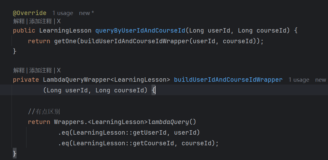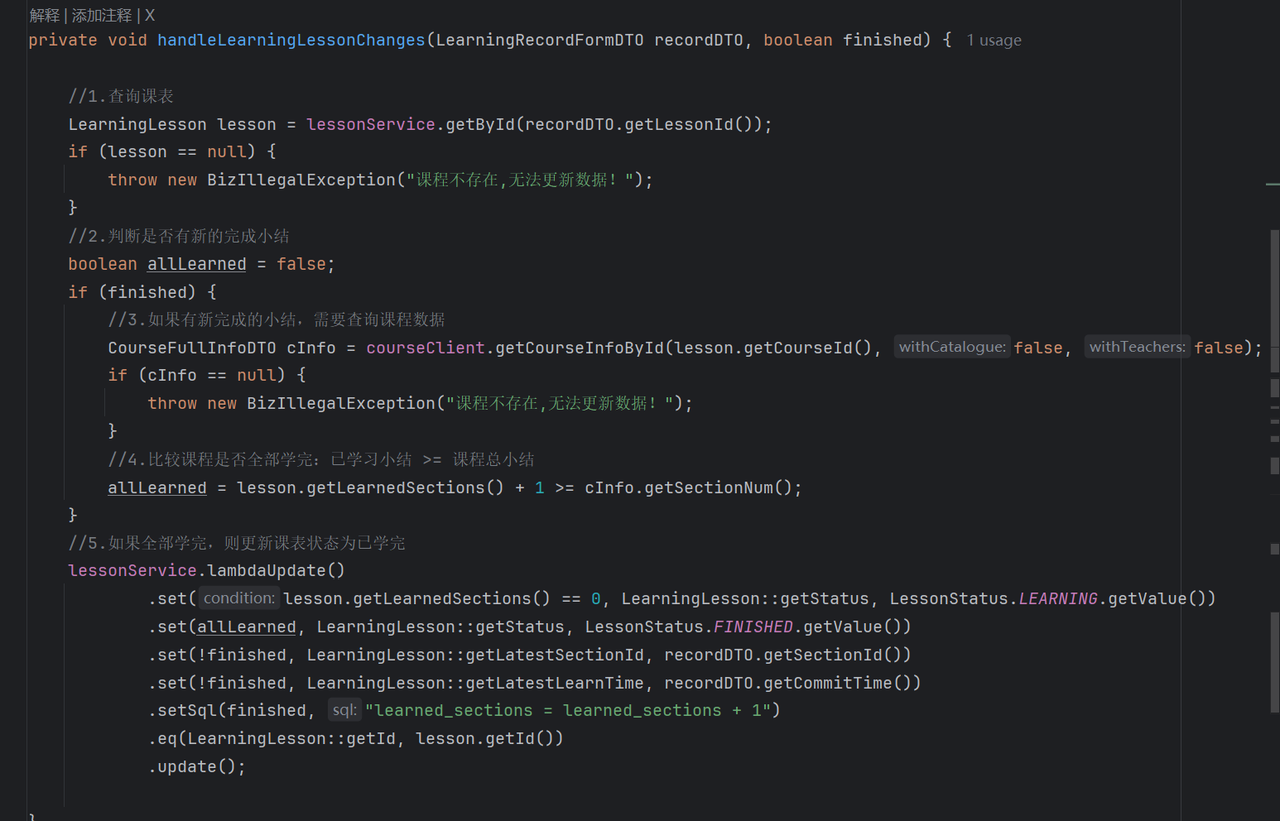 private void handleLearningLessonChanges(LearningRecordFormDTO recordDTO, boolean finished) {//1.查询课表LearningLesson lesson = lessonService.getById(recordDTO.getLessonId());if (lesson == null) {throw new BizIllegalException("课程不存在,无法更新数据!");}//2.判断是否有新的完成小结boolean allLearned = false;if (finished) {//3.如果有新完成的小结,需要查询课程数据CourseFullInfoDTO cInfo = courseClient.getCourseInfoById(lesson.getCourseId(), false, false);if (cInfo == null) {throw new BizIllegalException("课程不存在,无法更新数据!");}//4.比较课程是否全部学完:已学习小结 >= 课程总小结allLearned = lesson.getLearnedSections() + 1 >= cInfo.getSectionNum();}//5.如果全部学完,则更新课表状态为已学完lessonService.lambdaUpdate().set(lesson.getLearnedSections() == 0, LearningLesson::getStatus, LessonStatus.LEARNING.getValue()).set(allLearned, LearningLesson::getStatus, LessonStatus.FINISHED.getValue()).set(!finished, LearningLesson::getLatestSectionId, recordDTO.getSectionId()).set(!finished, LearningLesson::getLatestLearnTime, recordDTO.getCommitTime()).setSql(finished, "learned_sections = learned_sections + 1").eq(LearningLesson::getId, lesson.getId()).update();