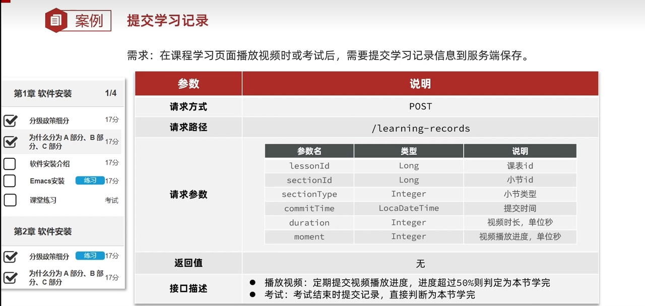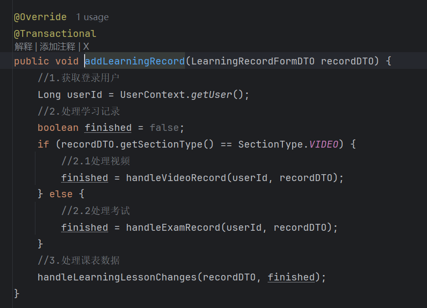 public void addLearningRecord(LearningRecordFormDTO recordDTO) {//1.获取登录用户Long userId = UserContext.getUser();//2.处理学习记录boolean finished = false;if (recordDTO.getSectionType() == SectionType.VIDEO) {//2.1处理视频finished = handleVideoRecord(userId, recordDTO);} else {//2.2处理考试finished = handleExamRecord(userId, recordDTO);}//3.处理课表数据handleLearningLessonChanges(recordDTO, finished);