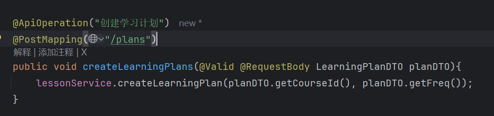 public void createLearningPlans(@Valid @RequestBody LearningPlanDTO planDTO){lessonService.createLearningPlan(planDTO.getCourseId(), planDTO.getFreq());