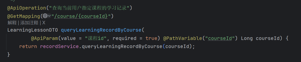 LearningLessonDTO queryLearningRecordByCourse(@ApiParam(value = "课程id", required = true) @PathVariable("courseId") Long courseId) {return recordService.queryLearningRecordByCourse(courseId);