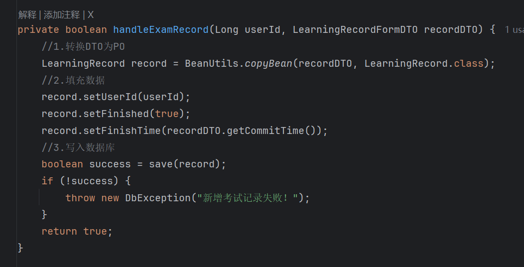 private boolean handleExamRecord(Long userId, LearningRecordFormDTO recordDTO) {//1.转换DTO为POLearningRecord record = BeanUtils.copyBean(recordDTO, LearningRecord.class);//2.填充数据record.setUserId(userId);record.setFinished(true);record.setFinishTime(recordDTO.getCommitTime());//3.写入数据库boolean success = save(record);if (!success) {throw new DbException("新增考试记录失败!");}return true;