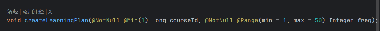 void createLearningPlan(@NotNull @Min(1) Long courseId, @NotNull @Range(min = 1, max = 50) Integer freq);