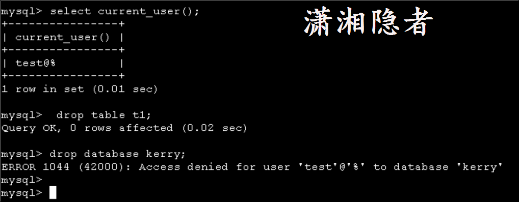2 rows in set (0.00 sec)mysql> mysql> grant drop on kerry.t1 to test@'%';