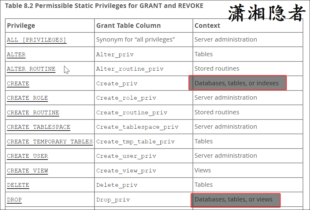 其实具体原因是你没有留意MySQL官方文档关于CREATE/DROP权限的详细说明,你以为的CREATE权限是创建表的权限,DROP权限是DROP表的权限.其实不然, 如下截图所示,CREATE权限包含创建数据库、表或索引的权限,而DROP权限包DROP数据库、表或视图的权限. 至于为什么MySQL没有细化这些权限.我们也不清楚.但是从上面实验来看, 我都倾向于这个是一个逻辑上的"Bug".