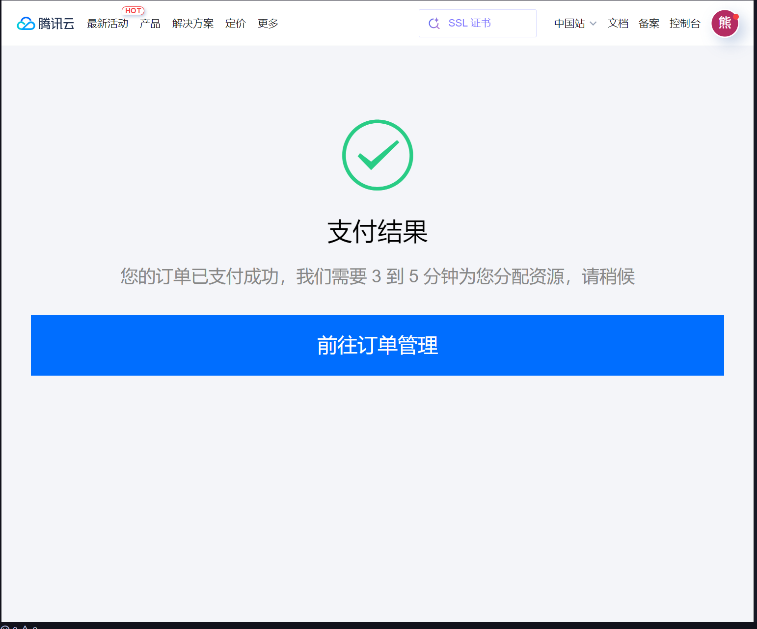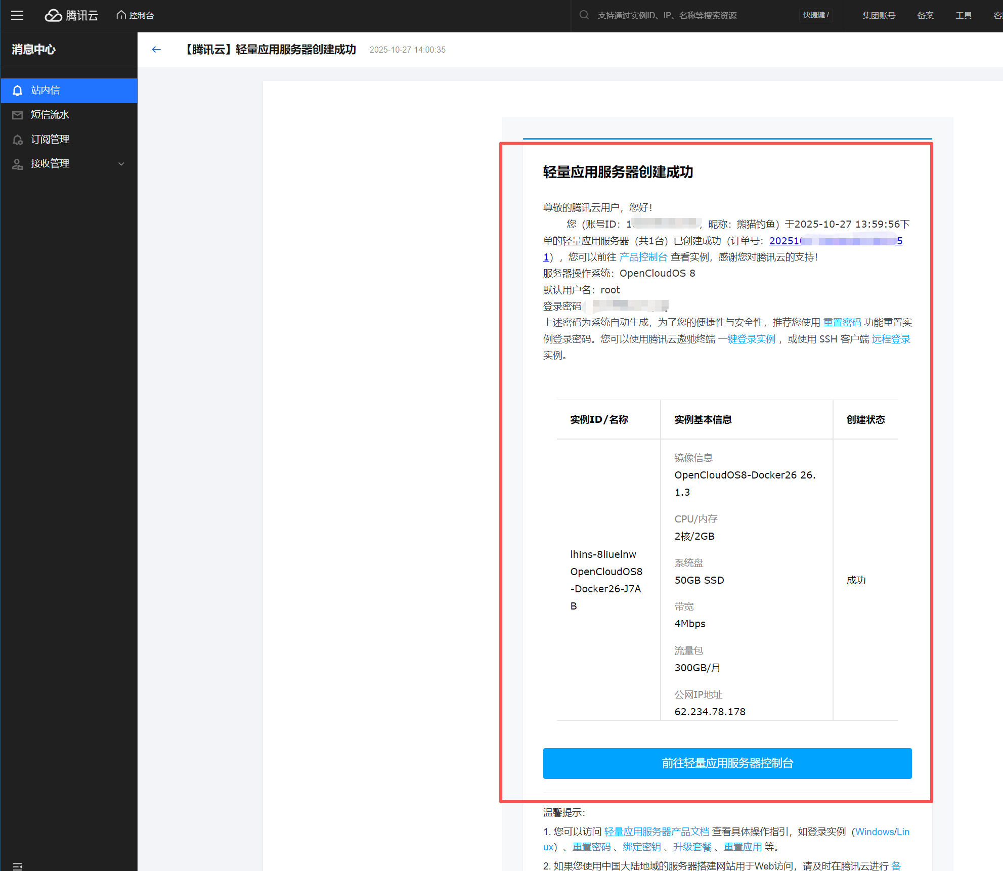 OK,轻量应用服务我们零元购了!会收到成功的通知。