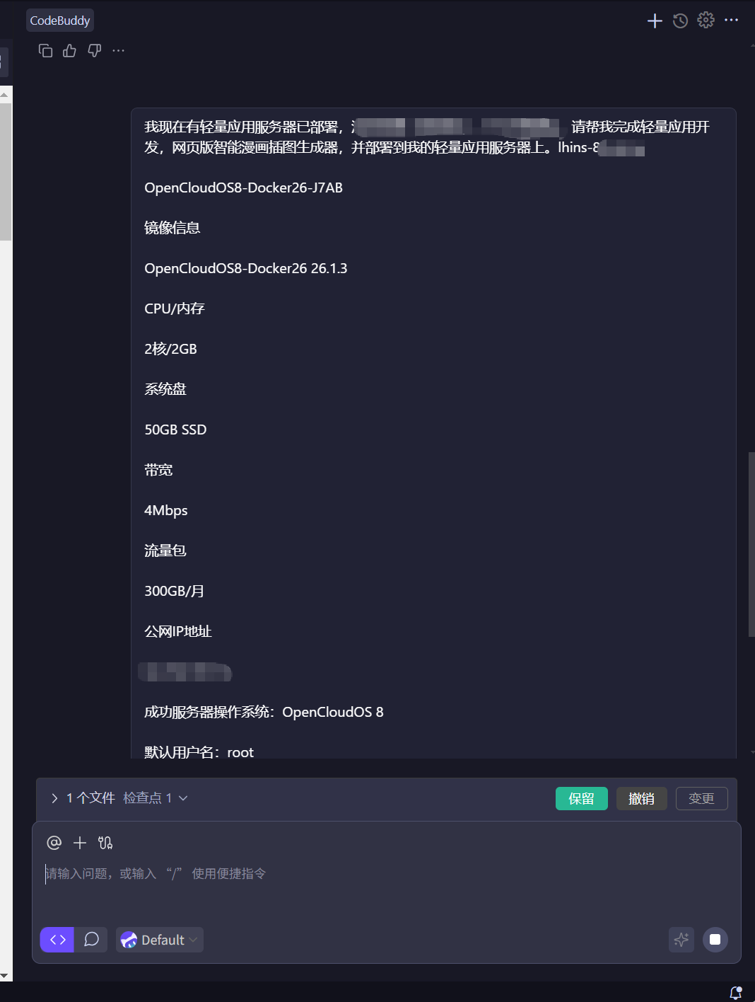 首先我们可以通过CodeBuddy IDE内部授权登录轻量应用服务器领取免费套餐。可以直接聊天问CodeBuddy该怎么做?如下所示