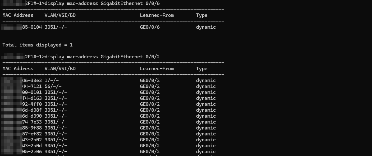 4、分别查询接入交换机B上GE0/0/2接口和GE0/0/6接口学习到的MAC,发现GE0/0/2接口学习到的MAC非常多,而GE0/0/6接口学习到的MAC只有一个,且为故障电脑MAC。