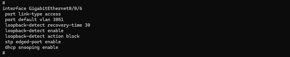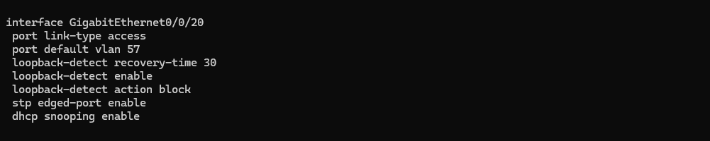 6、由于接入层端口配置了边缘端口、BPDU保护和环路检测,环路检测规则为block,但查看环路检测状态端口却又没有被阻塞,因此可以断定GE0/0/2接口下接了HUB,且该HUB又与接入交换机A相连。也就是说HUB的两个端口和两台不同接入交换机上不同VLAN下的接口相连了,造成了VLAN间的环路。查看接入交换机A与HUB相连的接口,发现接口配置为vlan57。