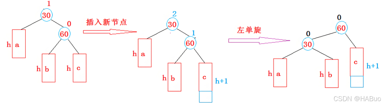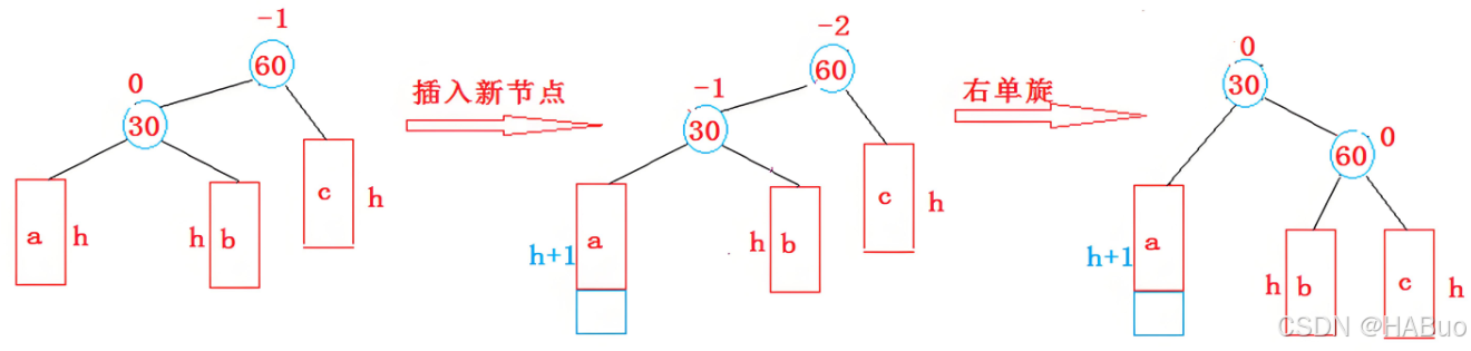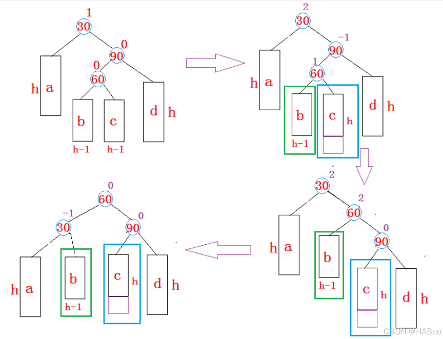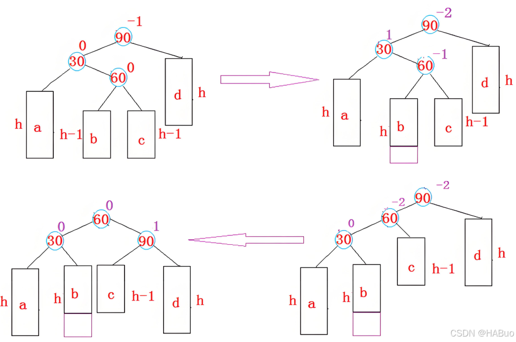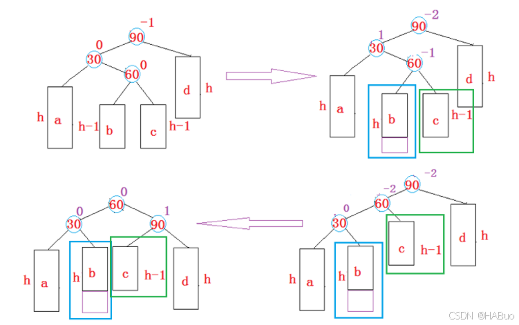 相信在左右双旋的加持下,这个会迎刃而解。两点:1.90右旋,30左旋。2.调整之后平衡因子的确立,还是分为插入节点之后60的平衡因子为0还是1还是-1。