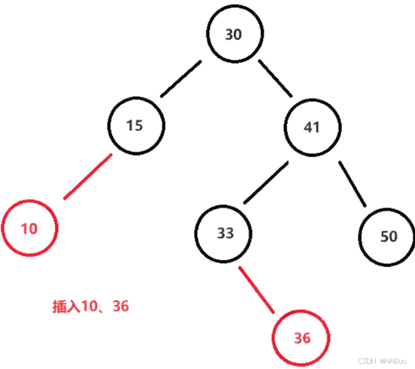 AVL树的插入同样要遵守二叉搜索树的插入规则,即都是在叶子节点进行插入,第一个插入的元素就是根节点,后面插入的元素根据性质判断插入位置。比如在下面这颗树中插入10和36: