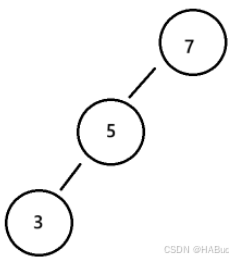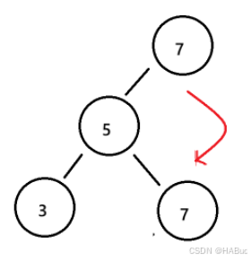很明显,这是一颗左单树,不符合AVL树的定义,此时我想把它变成一颗AVL树,该怎么做呢。我们把 5 的父节点7 “向下压”,变成 5 的右孩子,这样就成为了一颗AVL树。这个“向下压”的过程 就叫做旋转。由于7 是“向下压”成 5 的右孩子,所以整个过程又叫右单旋。那如果节点5 本身就有右孩子呢,只需要把7 的左孩子指向5 的右孩子就可以了: