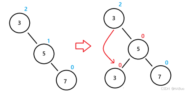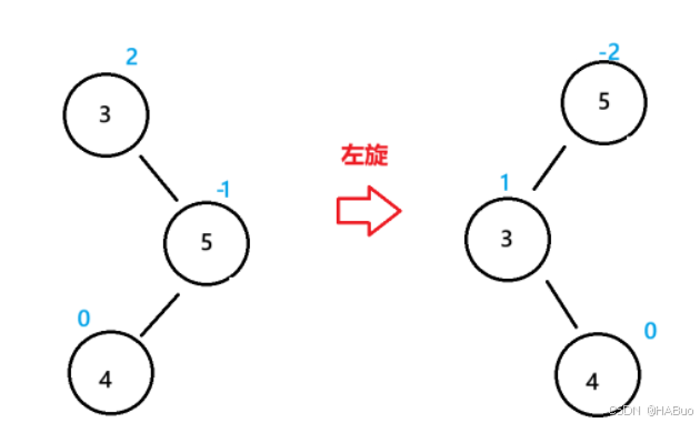 同理地,把这颗右单树变成AVL树的过程,就称之为左单旋。如果节点5 本身就有左孩子,那么需要把3 的右孩子指向5 的左孩子。