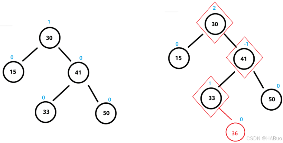 可以观察到当我们插入一个36时,它的父亲的平衡因子就变为了1,进一步的观察到41节点的平衡因子变成了-1,更进一步的发现根节点的平衡因子变成了2,发现什么规律了吗?这些节点均是36的祖先,由此可以得到,当插入节点,需要更新平衡因子的部分是且只能是它的祖先节点。