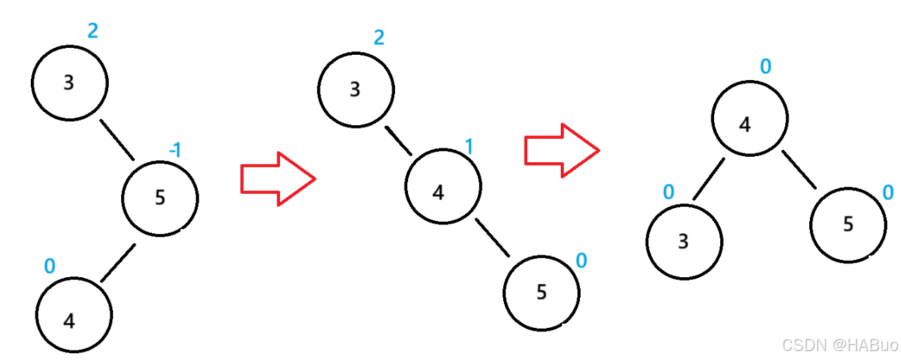 既然一次旋转不行,那我们就试试旋转两次嘛,我们先对节点5 进行一次右旋,再对节点3 进行一次左旋,结果终于是一颗AVL树了: